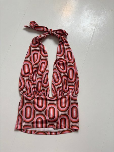 Topp med knytband i nacken och ett mönster av ovala former i olika nyanser av rosa, brunt och vitt. Knappt använts.
