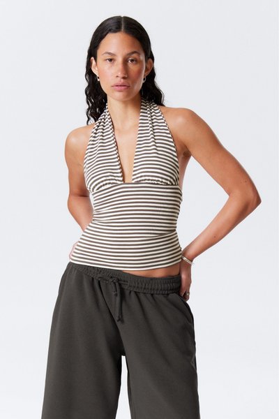 Trendigt halterneck-linne med ett randigt mönster i en smickrande design. Perfekt för att skapa en stilfull och avslappnad look.
