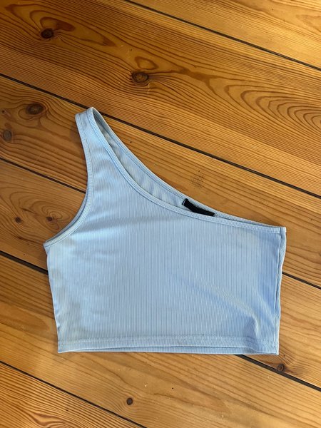 Toppen har en asymmetrisk design med en axel. Den är ribbad och har en figurnära passform.