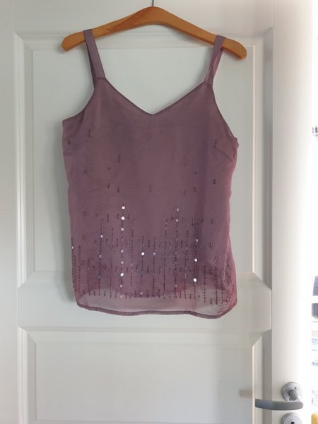 Ärmlös topp i en vacker lila nyans. Den har en V-ringning och är dekorerad med paljetter nedtill, vilket ger en elegant touch.