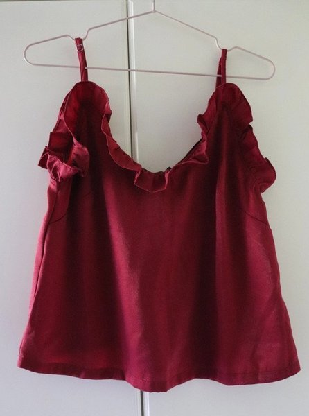 Vinröd sommartopp med smala axelband och volangdetaljer runt halsringningen och ärmarna.