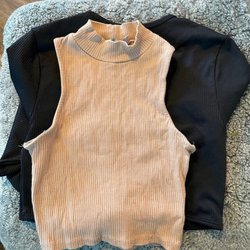 Ett paket med sju olika överdelar. Innehåller en brun hoodie, en svart tröja, en vit blus med svart rutmönster, en beige tröja, en ljusblå tröja och en vit tröja med spetsdetaljer.