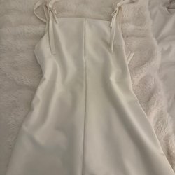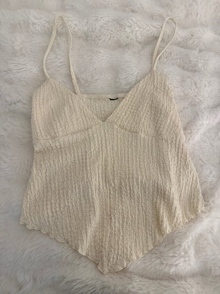 Topp med smala axelband och en strukturerad yta. Toppen har en V-ringning och en figurnära passform upptill som övergår i en utsvängd nederdel med en spetsig fåll framtill.