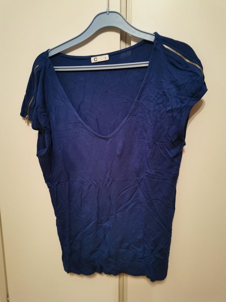 Mörkblå kortärmad blus med v-ringning och dekorativa dragkedjor på axlarna.