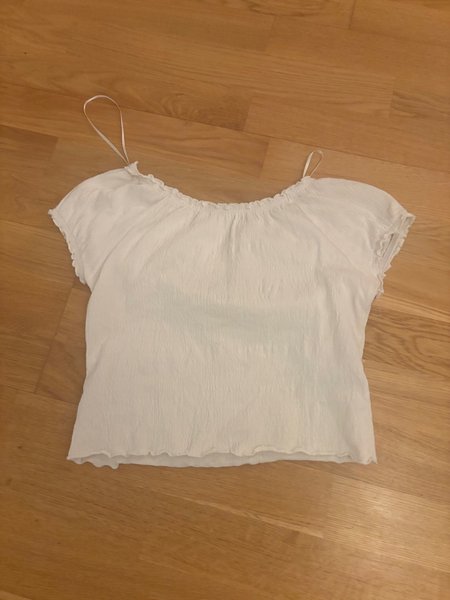 Vit topp med korta ärmar . Toppen har en rynkad urringning och en vågig kant nedtill.