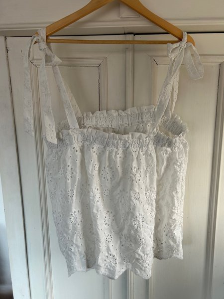 Vitt linne med broderade detaljer över hela plagget. Toppen har knytband vid axlarna och resår upptill för en bekväm passform. Designen inkluderar en volangkant längs överkanten. Onesize