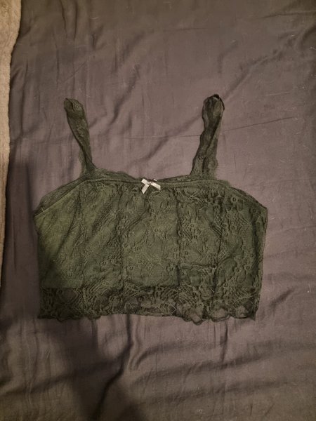 Toppen har smala axelband och en liten rosett framtill. Den är designad med spetsdetaljer över hela plagget, vilket ger en feminin touch.