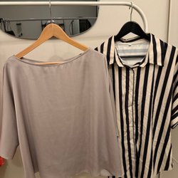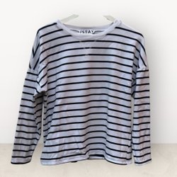 Topp med puffärmar och rund halsringning. Tröjan har ett randigt mönster.