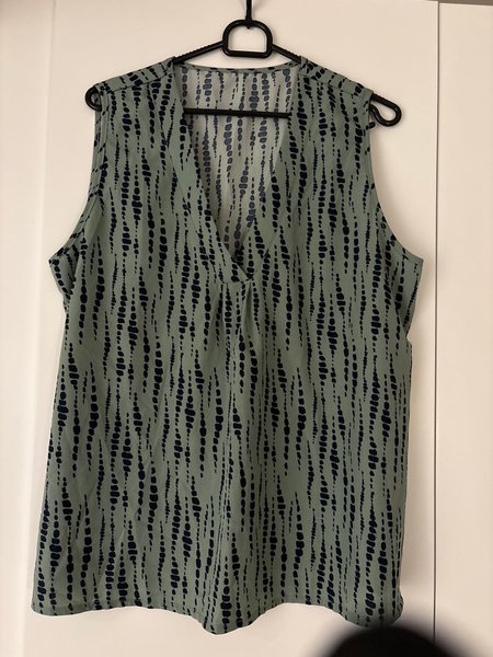 Ärmlös topp med V-ringning och ett mönster av vertikala, oregelbundna streck. Toppen har en lös passform och är lämplig för olika tillfällen.