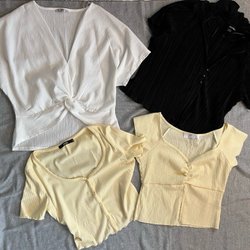 Här är ett paket med fyra olika damtoppar. En blå t-shirt med korta ärmar, en vit ärmlös topp med volanger, en mörkgrå ärmlös topp med detaljer och en mörkblå t-shirt med korta ärmar och gulddetaljer. Genomsnittlig längd - 50-58 cm, Genomsnittlig bredd ärm till ärm - 47-49 cm.