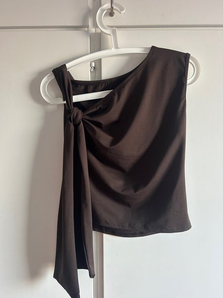 Snygg brun topp med en asymmetrisk design. Toppen har en knuten detalj på ena axeln som skapar en draperad effekt över bysten och midjan. Den andra axeln är slät och rundad. Nederkanten är rakt skuren.