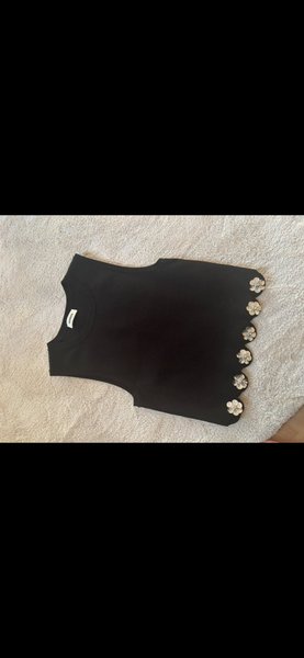 Svart ärmlös topp med rund halsringning. Toppen har dekorativa blomformade applikationer längs nederkanten.