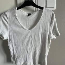 Vit ribbad crop top med spetsdetaljer. Den har smala axelband och en smickrande rynkning framtill.