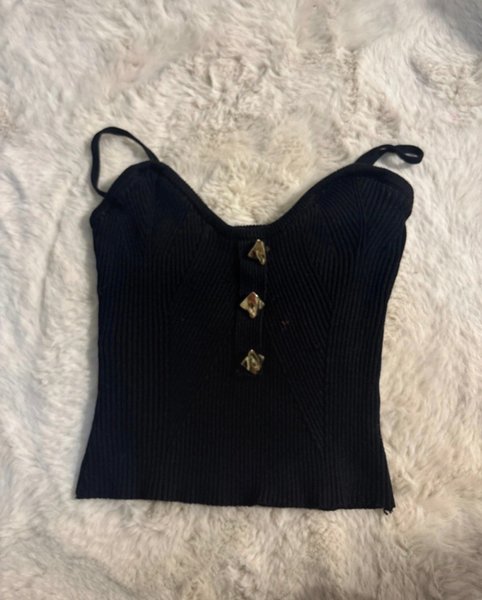 Svart ribbad topp med smala axelband och dekorativa guldfärgade knappar framtill. Toppen har en figurnära passform och en hjärtformad urringning.