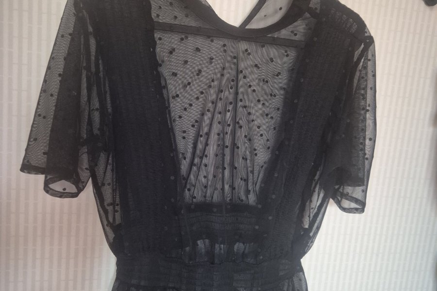 Svart topp med korta ärmar och rund hals. Toppen har en genomskinlig design med prickigt mönster och resår i midjan.