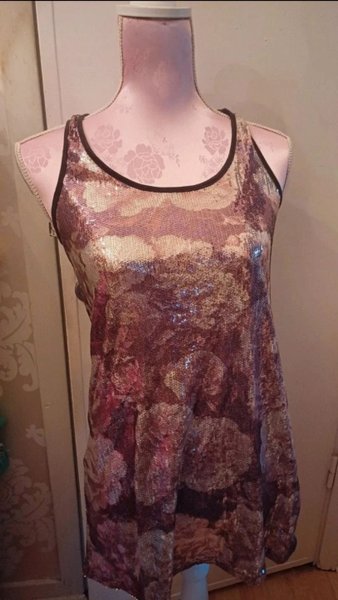 Ärmlös topp med paljetter och mönster i olika nyanser. Finns ingen lapp men uppskattas passa till en size S/M.