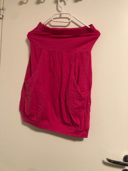 Topp i en livlig rosa färg med en avslappnad passform. Den har en bred, elastisk mudd upptill som kan bäras som en off-shoulder-stil eller högre upp. Midjan är också elastisk, vilket skapar en smickrande silhuett. Praktiska fickor finns på sidorna, vilket ger plagget en avslappnad känsla.