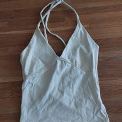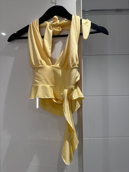 Toppen har en halterneck-design som knyts i nacken, vilket skapar en smickrande V-ringning. Midjan är markerad med en rynkad detalj och en knytning i sidan som ger en omlott-effekt och en volangkant nedtill.