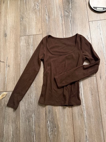 En långärmad tröja i en mörkbrun nyans. Tröjan har en fyrkantig halsringning och en figurnära passform. Ärmarna är långa och slutar vid handleden. Super mjuk stretchig