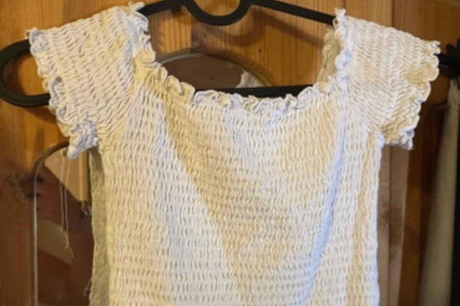 Toppen har en smockad design över hela plagget, vilket ger en strukturerad och flexibel passform. Den har korta ärmar och en fyrkantig halsringning med volangdetaljer längs kanterna. Nederkanten är också volangkantad.