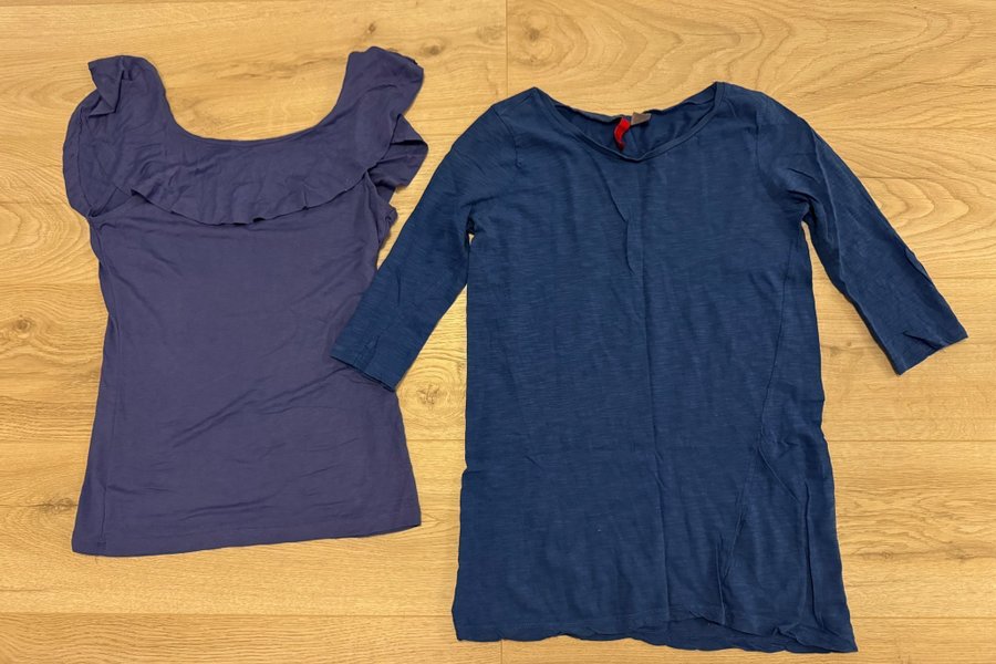 Två fina överdelar i blå nyanser. Den ena är en kortärmad blus med volangdetaljer runt halsen. Den andra är en tunika med trekvartsärm.