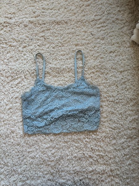 Toppen har smala axelband och är täckt av spetsmönster. Den har en vågig kant upptill och nedtill.