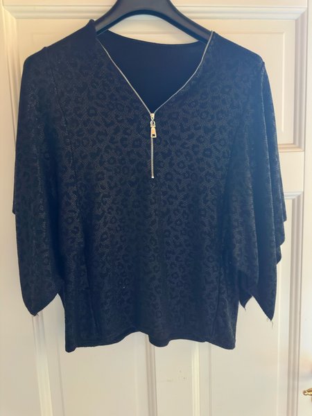 Svart topp med leopardmönster och dragkedja framtill. Toppen har en avslappnad passform med vida ärmar som slutar vid armbågen.