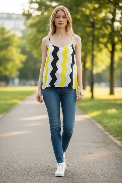 Topp med smala axelband och ett sicksackmönster i gult, svart och vitt.