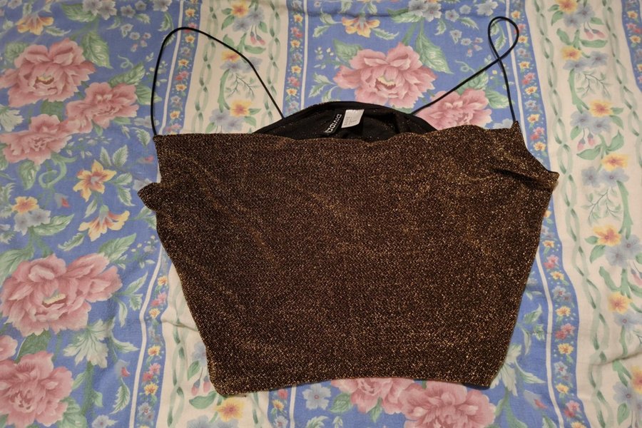 Glittrig crop top med spagetti-straps. Fint skick, använd en gång. Glansigt tyg med mycket stretch. Ser guldig/bronsfärgad ut. Storlek L.