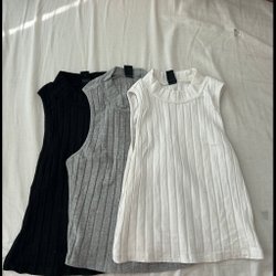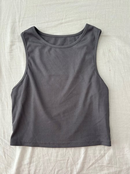Ribbad topp i en mörkgrå nyans. Toppen har en rundad halsringning och ärmlös design. Passar bra för en avslappnad stil.