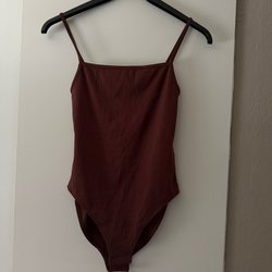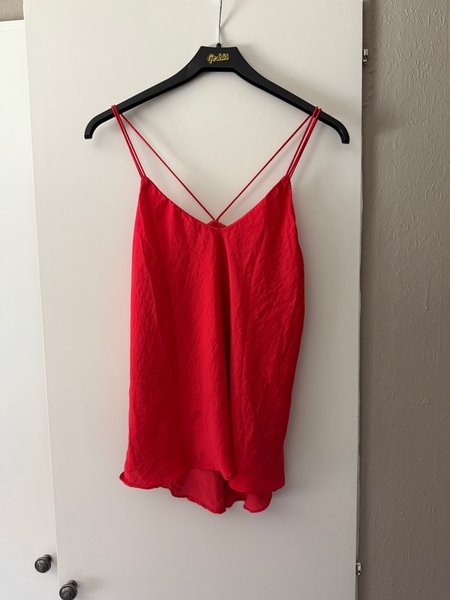 Rött linne med tunna axelband som korsas i ryggen. Toppen har en lös passform och en lätt draperad urringning.