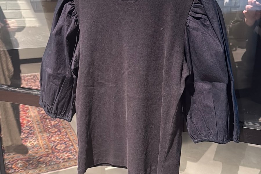 Svart topp med puffärmar. Ärmarna är trekvartslånga och har resår vid ärmsluten. Toppen har en rund halsringning.