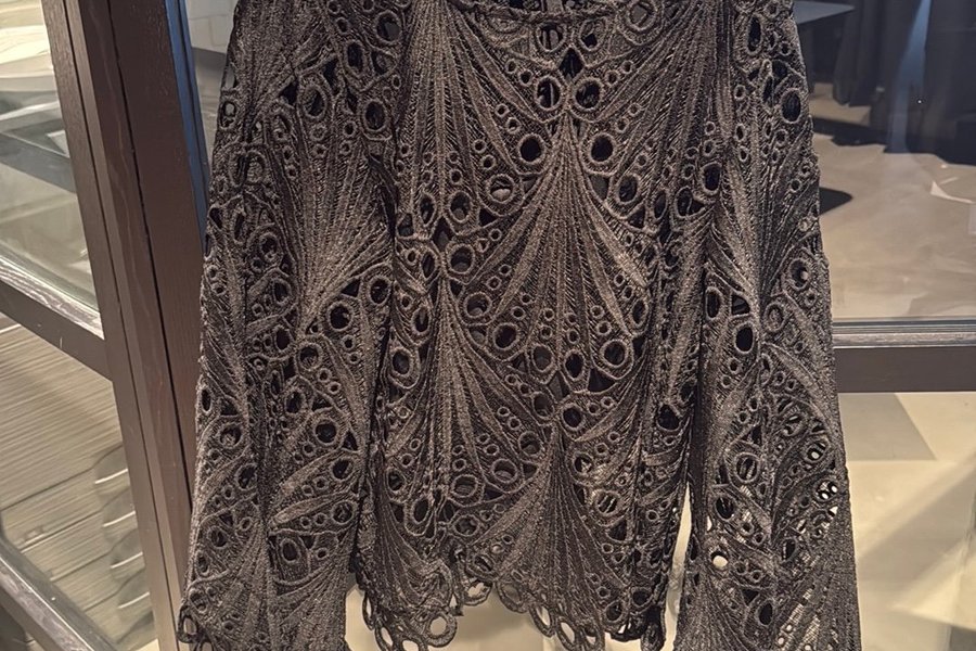 Svart spetströja med långa ärmar och rund halsringning. Tröjan har ett detaljerat mönster med utskurna cirklar och vågiga kanter nedtill och vid ärmsluten.linne under