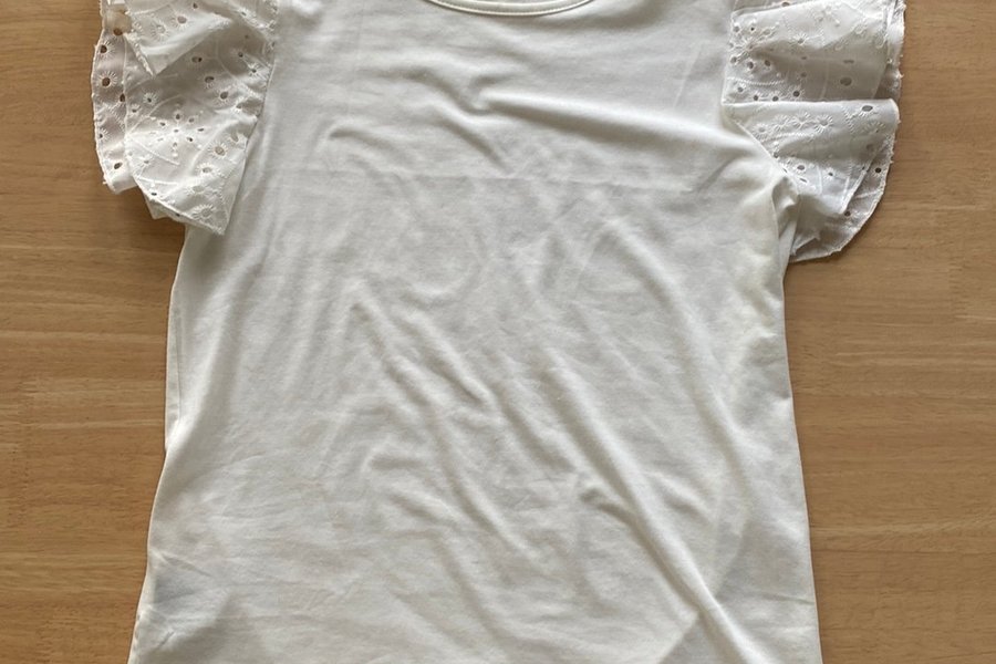 Vit topp med volangärmar. Ärmarna har broderade detaljer med små hål. Det finns ingen lapp i men jag tröjan är ungefär i storlek M.