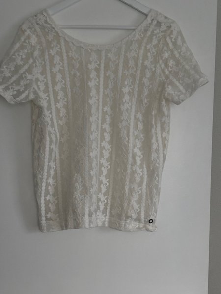 Blonde top med korte ærmer og rund halsudskæring. Toppen har et detaljeret blomstermønster i blonderne og en lille sort blomsterdetalje nederst i venstre side.