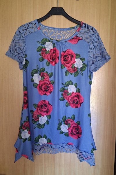 Blå topp med blommigt mönster i rött och vitt. Toppen har korta ärmar och en rund halsringning med spetsdetaljer. Spetsdetaljer finns även längs nederkanten.