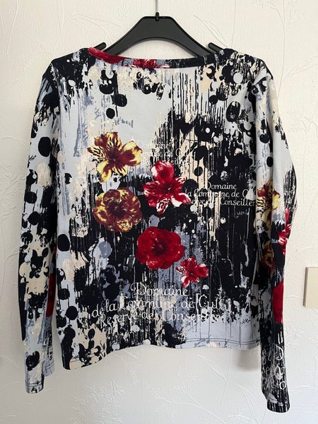 Långärmad tröja med ett abstrakt mönster i svart, grått och vitt, kompletterat med röda och gula blomdetaljer. Textinslag som "Domaine" och "la commune de Cult" är integrerade i designen. Tröjan har en rund halsringning.