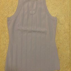 Kortärmad topp i ribbat tyg med V-ringning och tre knappar framtill. Toppen har en kortare passform och en lätt vågig nederkant.