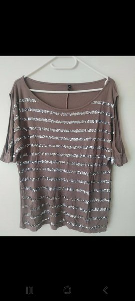 En brun topp med silverfärgade paljetter i ett randigt mönster. Toppen har korta ärmar och en rund halsringning.