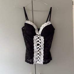 Set glittertopp och hotpants. Toppen är en halterneckmodell med tunna band och hotpantsen har matchande tunna band i midjan. Både toppen och hotpantsen har ett mönstrat parti framtill i kopparfärgade nyanser. Tyvärr har kartongen gått sönder