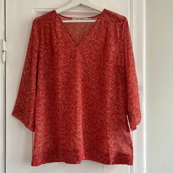 Svart och beige mönstrad topp med trekvartsärmar. Toppen har en rundad halsringning och ärmarna avslutas med en volangdetalj.