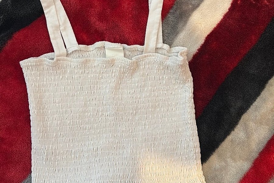 Vit smockad topp med smala axelband och en volangkant nedtill. Toppen har en elastisk design som ger en bekväm passform.