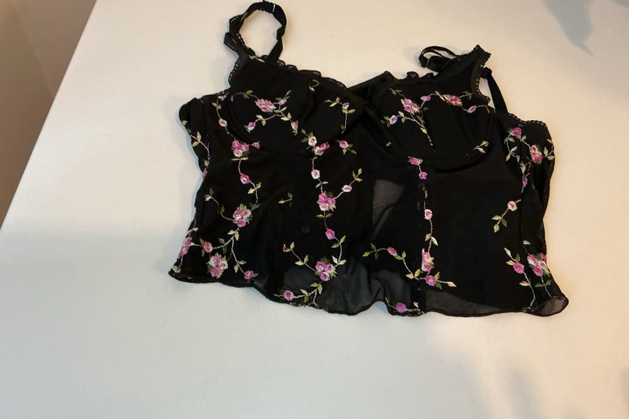Svart topp med tunna axelband och blommigt broderi i rosa och grönt. Toppen har en figurnära passform upptill och en lätt utsvängd nederkant.