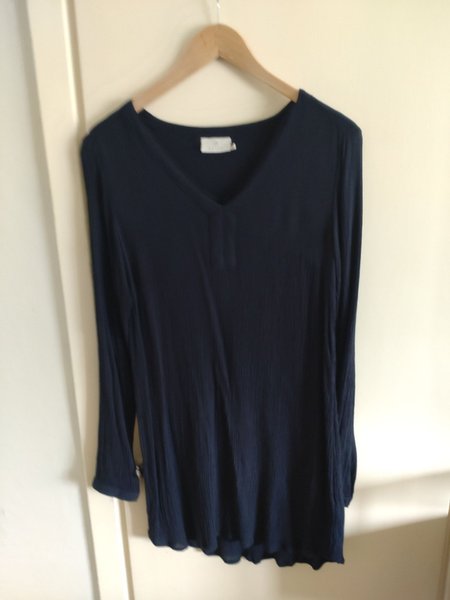 Mörkblå långärmad topp med V-ringning och en lätt texturerad yta. Toppen har en avslappnad passform och är perfekt för vardagsbruk.