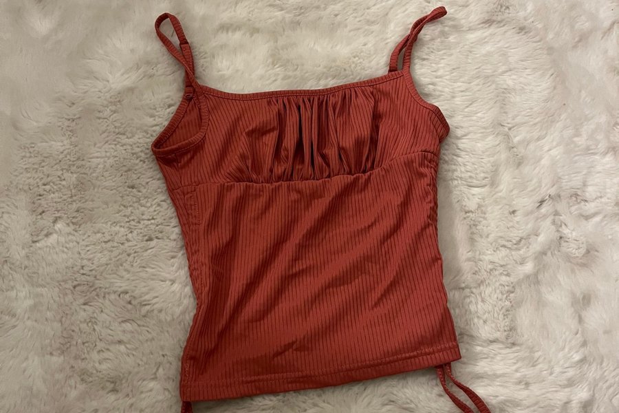 Röd, ribbad tubtopp med smala axelband. Toppen har en smockad överdel och en volang nedtill.