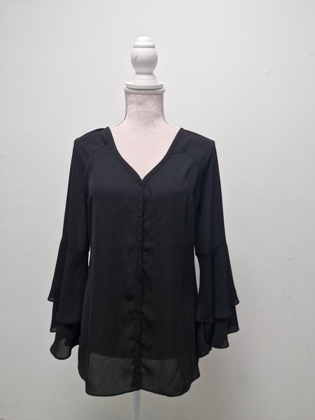 Svart skjorta V-ringning och knappar framtill. Ärmarna har en volangdetalj som ger en elegant touch.