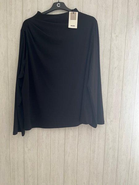 Svart långärmad topp med en elegant design. Toppen har en draperad halsringning som ger en sofistikerad touch. Ärmarna är långa och raka, och passformen är avslappnad. Vid ena axeln är det öppet. Ett mångsidigt plagg som passar för olika tillfällen. Knäpps bak med två knappar. Ny storlek xl