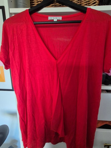 Röd topp med kort ärm och V-ringning. Toppen har en omlottdetalj framtill.