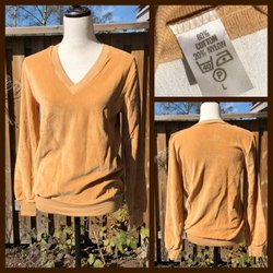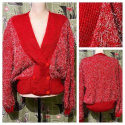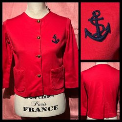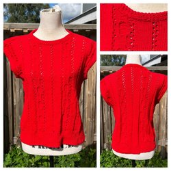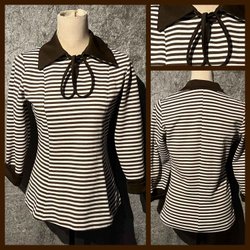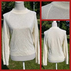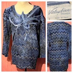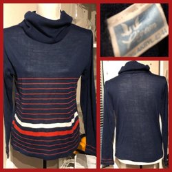 Snygg tröja finfin maskinstickad bomullsblandning. Knäppning vid byst. Enbart storlekslapp som tyvärr inte är läsbar. Bra skick, lite nopprig vid höften. Stretchig.