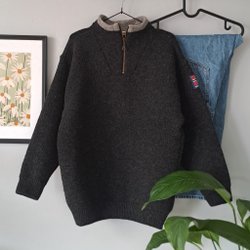 A knitted sweater with a V-neck and long sleeves. The sweater has a ribbed texture and a relaxed fit.